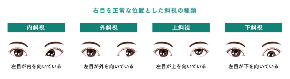 左右の眼が違う方向をみている状態のことを言い、その位置によって外斜視、内斜視、上下斜視などがあります。外斜視とは、片方の眼が目標を見ていて、その反対の眼が正面より外に向いている状態、内斜視とは内側を向いている状態を言います。